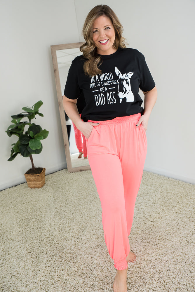 In a World Full of Unicorns, be a Bad A**! Celebrate your accomplishments and proudly display who you are.  Wear this black graphic tee with our Be Your Best Lounge Joggers in Coral to add a pop of color.