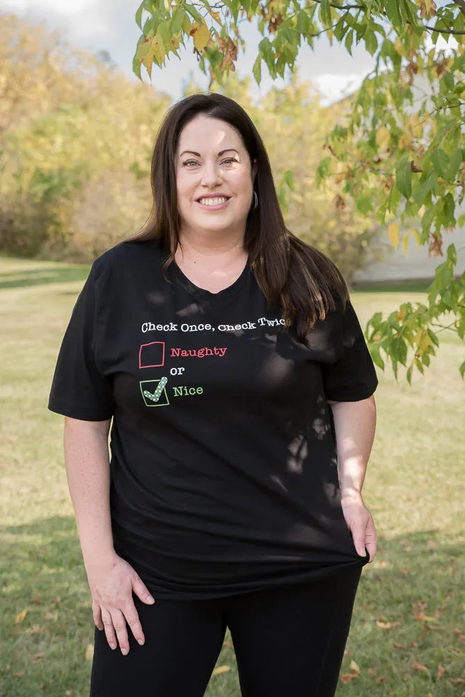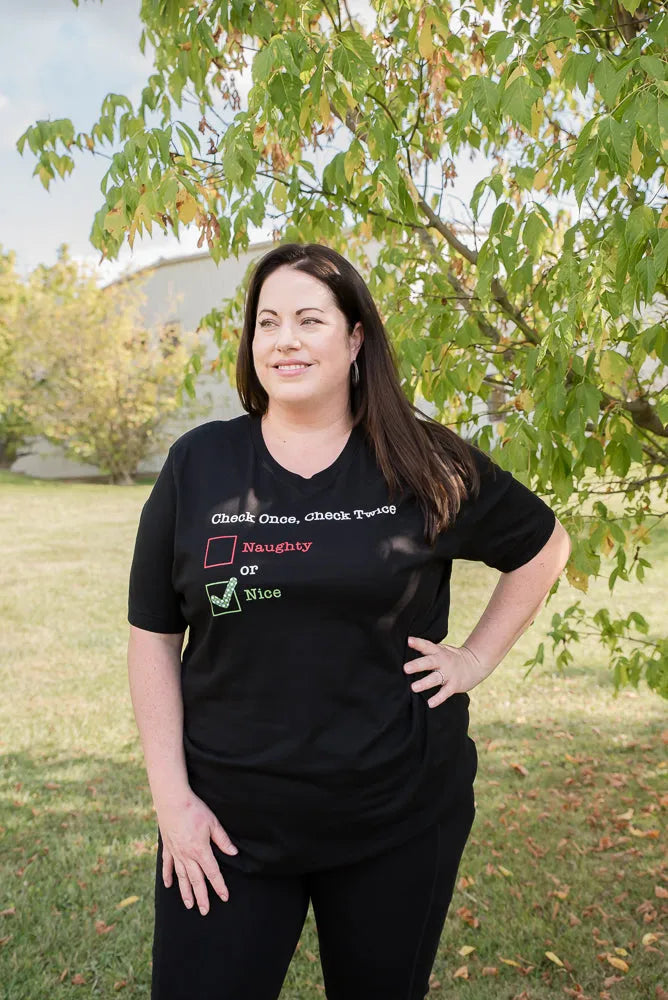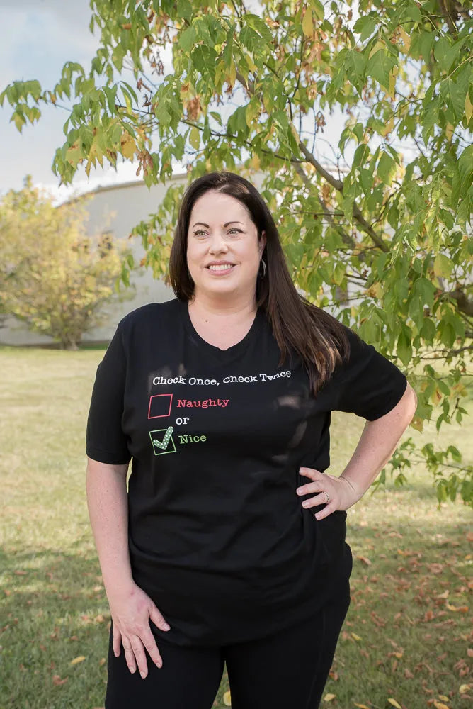 He's making a list, checking it twice....and found that you are naughty! This tee brings some fun into the holiday season and is sure to be a topic of conversation among friends. Wear it with Judy Blue jeans and your favorite Corkys shoes.