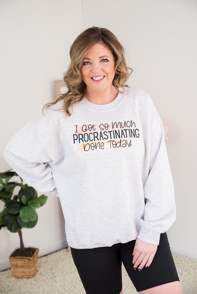 I got so much procrastinating done today.  Wear this humorous gray crewneck sweatshirt with leggings or denim any day of the week.
